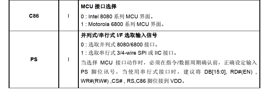 選擇通訊時(shí)序時(shí),硬件電路兩個(gè)腳位需要設(shè)定,本篇文章以8080時(shí)序講解,所以C86和PS引腳都接地