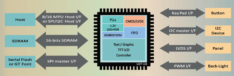 RA8876亦提供許多好用的內(nèi)建功能,可以減輕主系統(tǒng)的顯示負(fù)擔(dān),同時(shí)建立一個(gè)高效能的顯示解決方案,細(xì)部的功能有,具多層顯示的功能的暫存區(qū) (Multiple Display Buffers)、畫(huà)中畫(huà)功能 (Picture-in-Picture)、顯示通透/透明功能 (Opacity control)、幾何圖形繪制功能 (Geometric Drawing Engine)、內(nèi)建/外擴(kuò)文字顯示功能 (Built-In/External Text Display)、外部圖片讀取功能(DMA)、顯示區(qū)塊搬移或運(yùn)算功能 (BTE)以及顯示旋轉(zhuǎn)/鏡射功能等等。