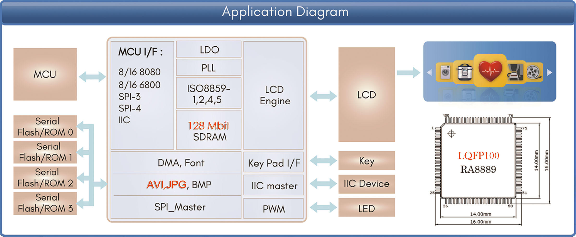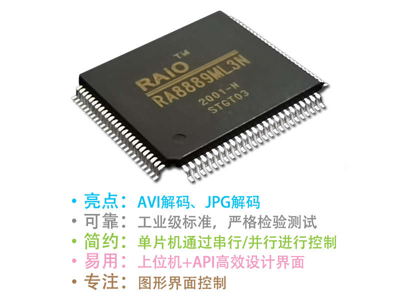 2020年瑞佑(RAIO)科技推出一顆新的芯片RA8889,這是繼RA8876,RA8877系列之后新推出來的產(chǎn)品,RA8889新增加硬件解碼功能,能對AVI、JPG進(jìn)行解碼,同時(shí)它還保留了RA8876,RA8877系列芯片原有圖形控制及處理功能,顯示性能上還得到了很多改善,并且內(nèi)建的顯存也增加到128Mb,極大方便各種圖形界面的設(shè)計(jì)與控制。
