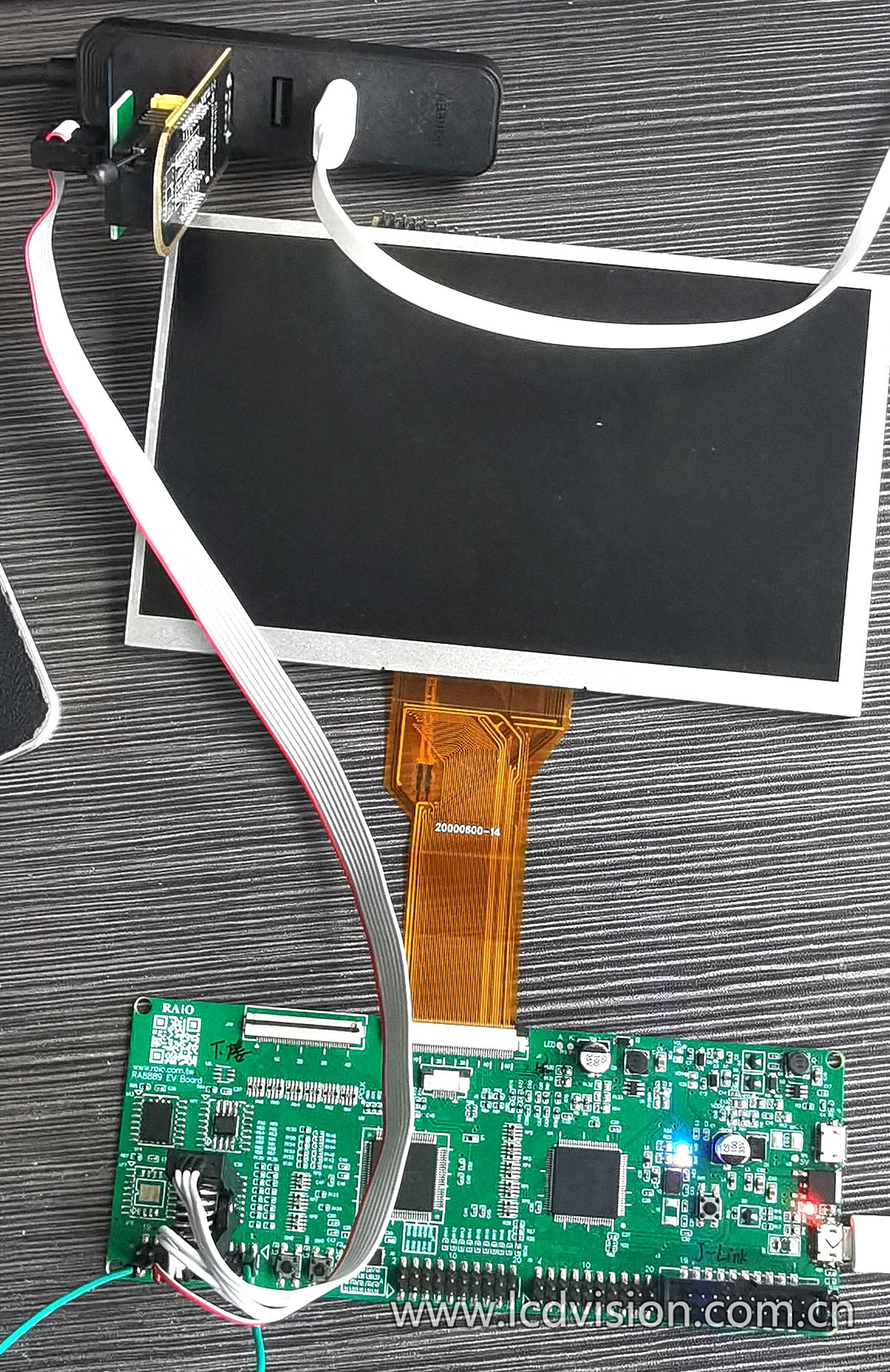 檢查接線無誤后,尤其要確認(rèn)CH341A是否接對了,沒問題再將其插入USB(如果指示燈不亮請馬上拔掉USB電源并檢查正負(fù)極連接是否正確)。如果有連接液晶屏,那么RA8889開發(fā)板的USB線也要插上供電。這時候接線圖如下,會看到板上的指示燈亮起來: