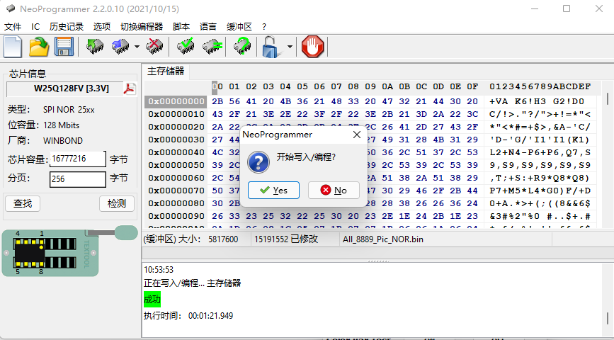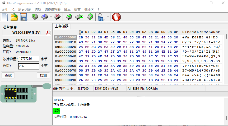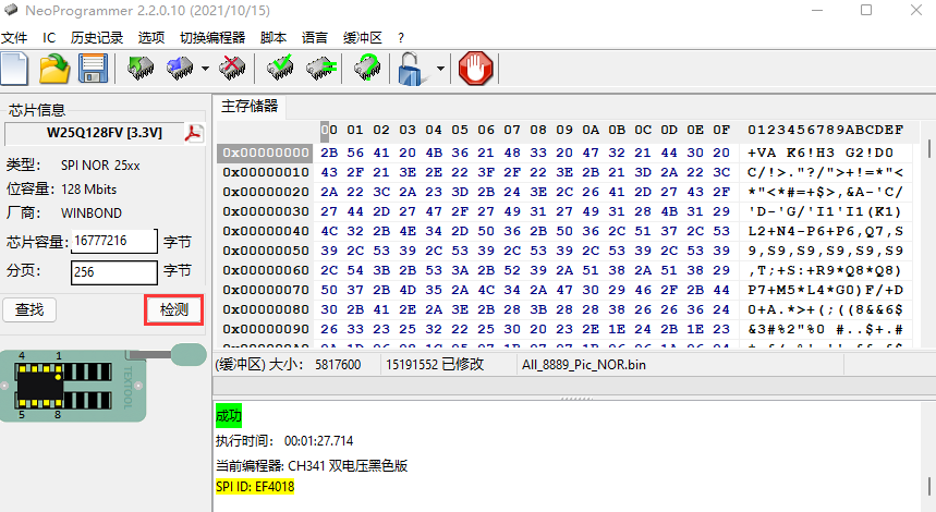 接下來打開燒錄器的燒錄軟件,推薦使用NeoProgrammer比較好用,這里簡單介紹一下。先選擇“檢測”自動查尋FLASH型號,如果查不到要檢查一下接頭是否對準(zhǔn),以及TEST1與3.3V是否接對。