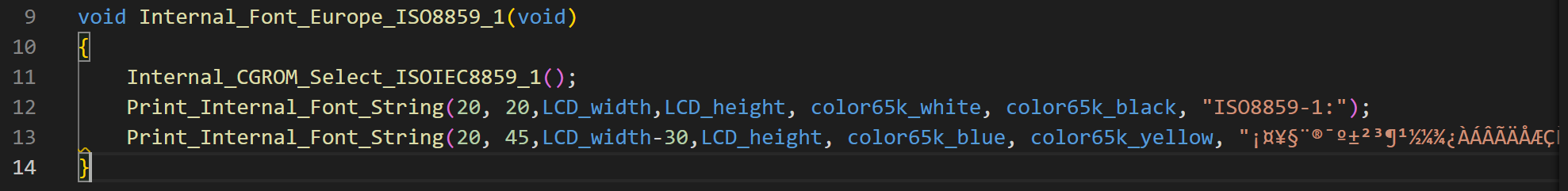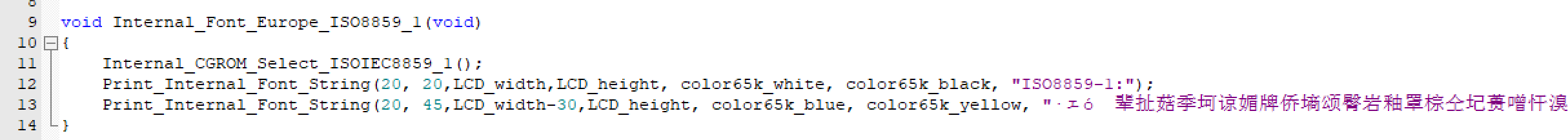 顯示內(nèi)建文字,調(diào)用API舉例:Internal_CGROM_Select_ISOIEC8859_1(); //選擇字符集