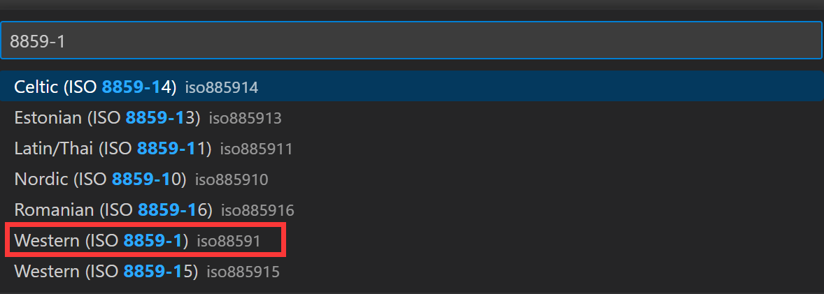 (3)選中后,再輸入“8859-1”即可找到“Westen(ISO 8859-1)”這個(gè)選項(xiàng):