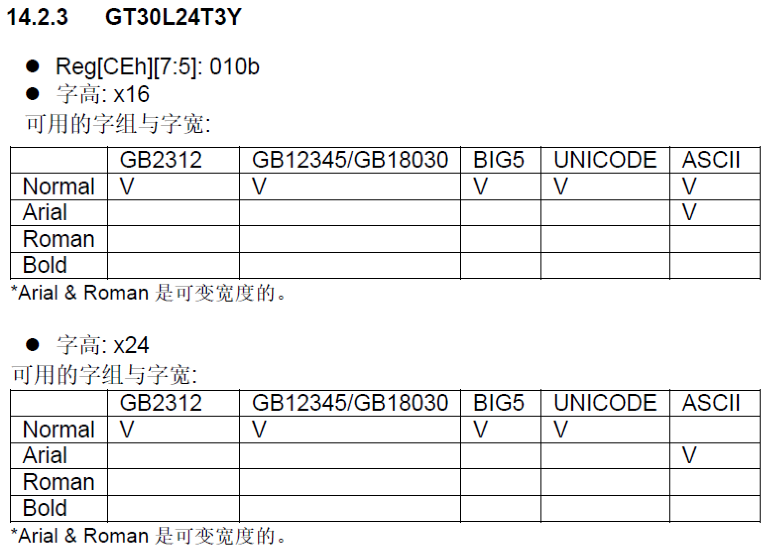 比如我們選擇這一顆字庫GT30L24T3Y,RA8889/RA8876所支持的字體如下表: