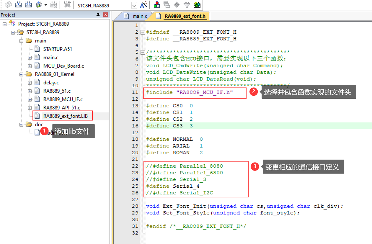 2. 將RA88xx_ext_font.LIB添加到Keil工程中,再引用讀寫(xiě)函數(shù)實(shí)現(xiàn)的頭文件,最后是變更通信方式的宏定義標(biāo)識(shí),如下圖: