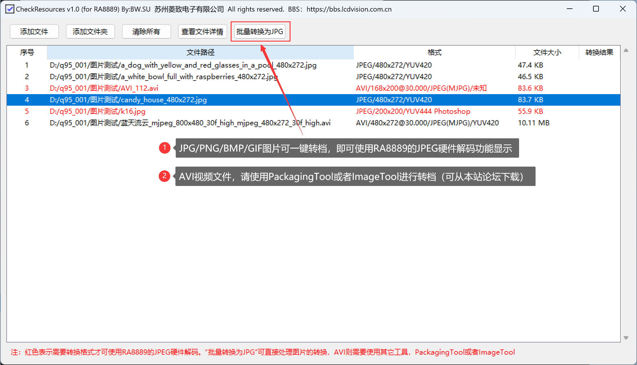 針對該問題,我們新開發(fā)了一款工具,CheckResources,用于檢查圖片和AVI是否滿足RA8889的要求,界面如下,歡迎下載使用: