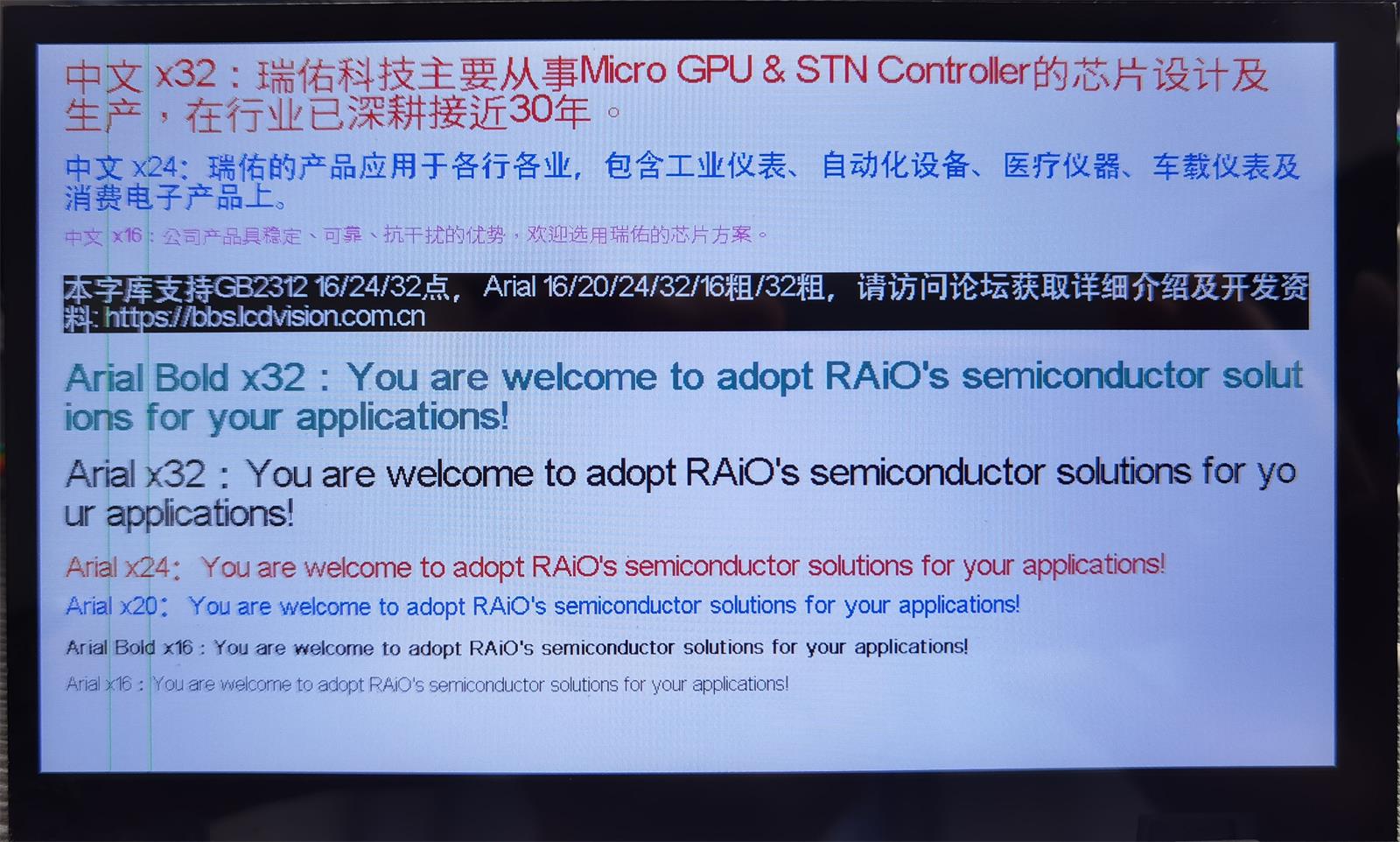 并非真的是矢量字庫(kù),而是我司可以為客戶(hù)提供各種點(diǎn)陣的ASCII字庫(kù),并且顯示是通過(guò)瑞佑的GPU硬件加速,不僅不會(huì)吃MCU的資源,顯示速度還是超快!